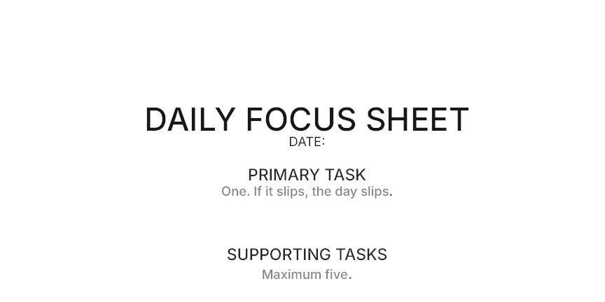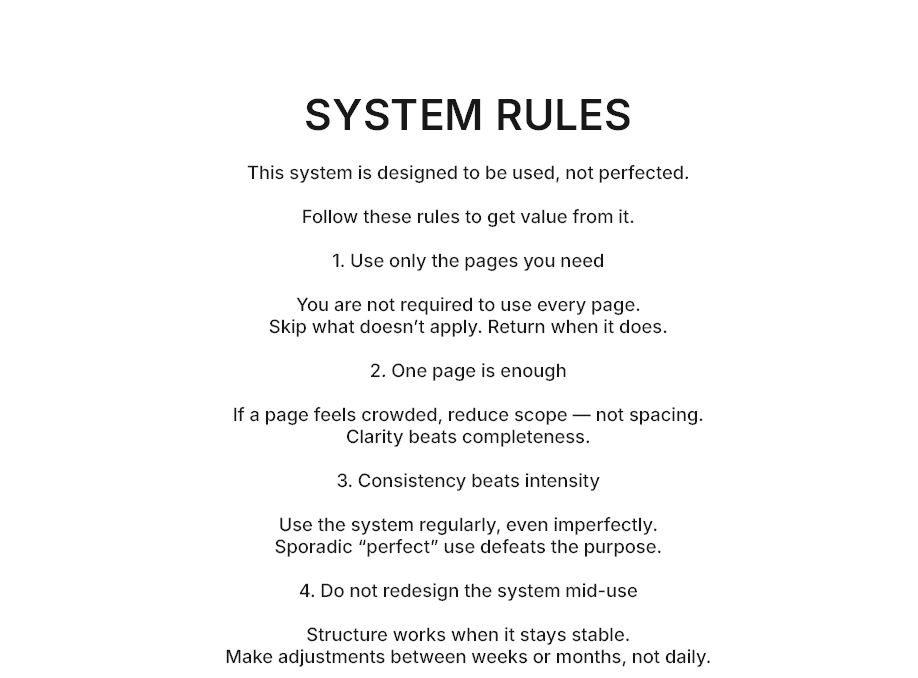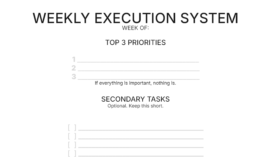A practical execution system designed to reduce friction, clarify priorities, and support consistent output. No fluff. No motivation. Just structure.